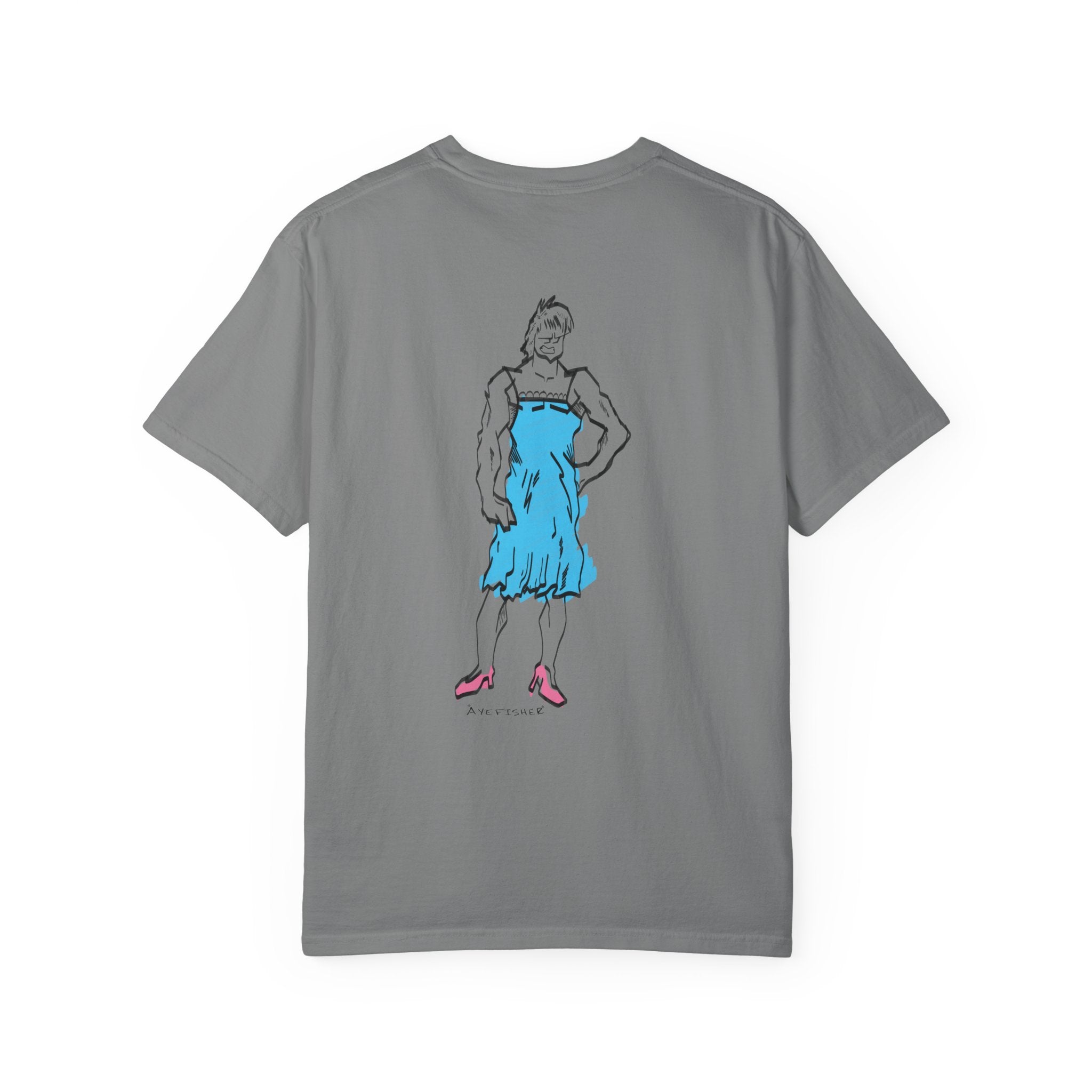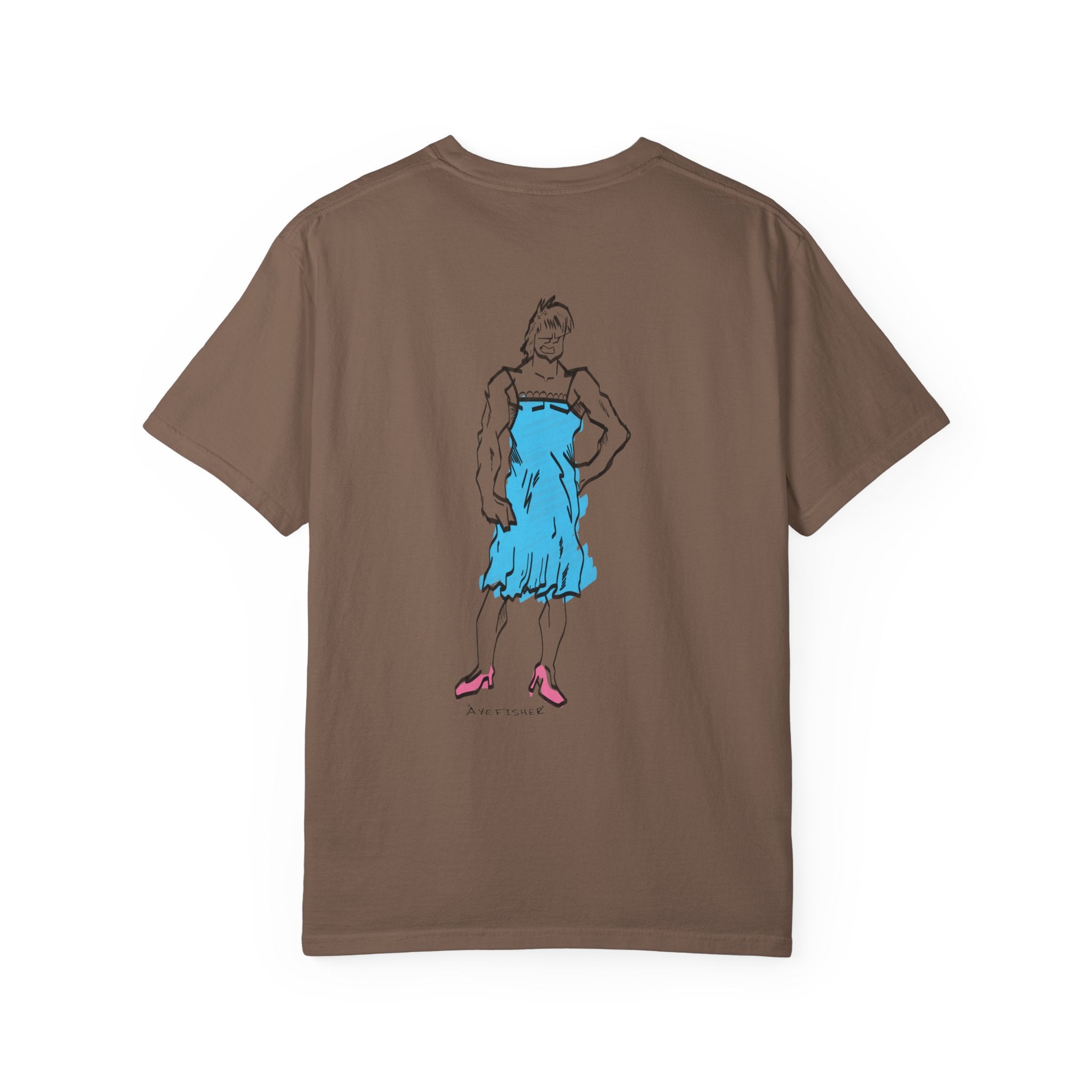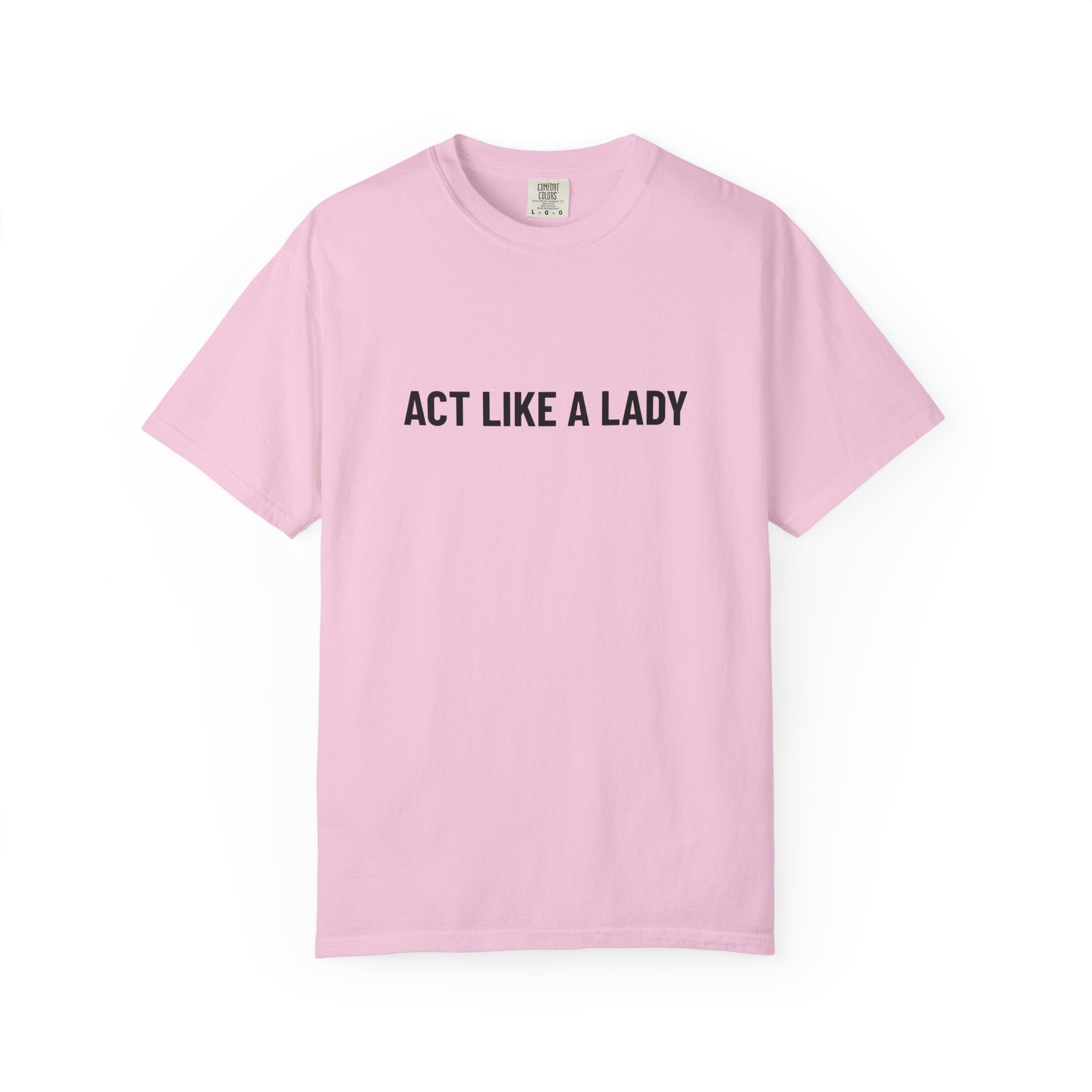 Soft as hell Comfort Colors tee for the masc who’s been aggressively lady-ed by strangers and family alike. Front says ‘Act Like a Lady’. Back features a masc lesbian in a dress looking like she lost a bet. Because nothing says femininity like visible discomfort in lace
