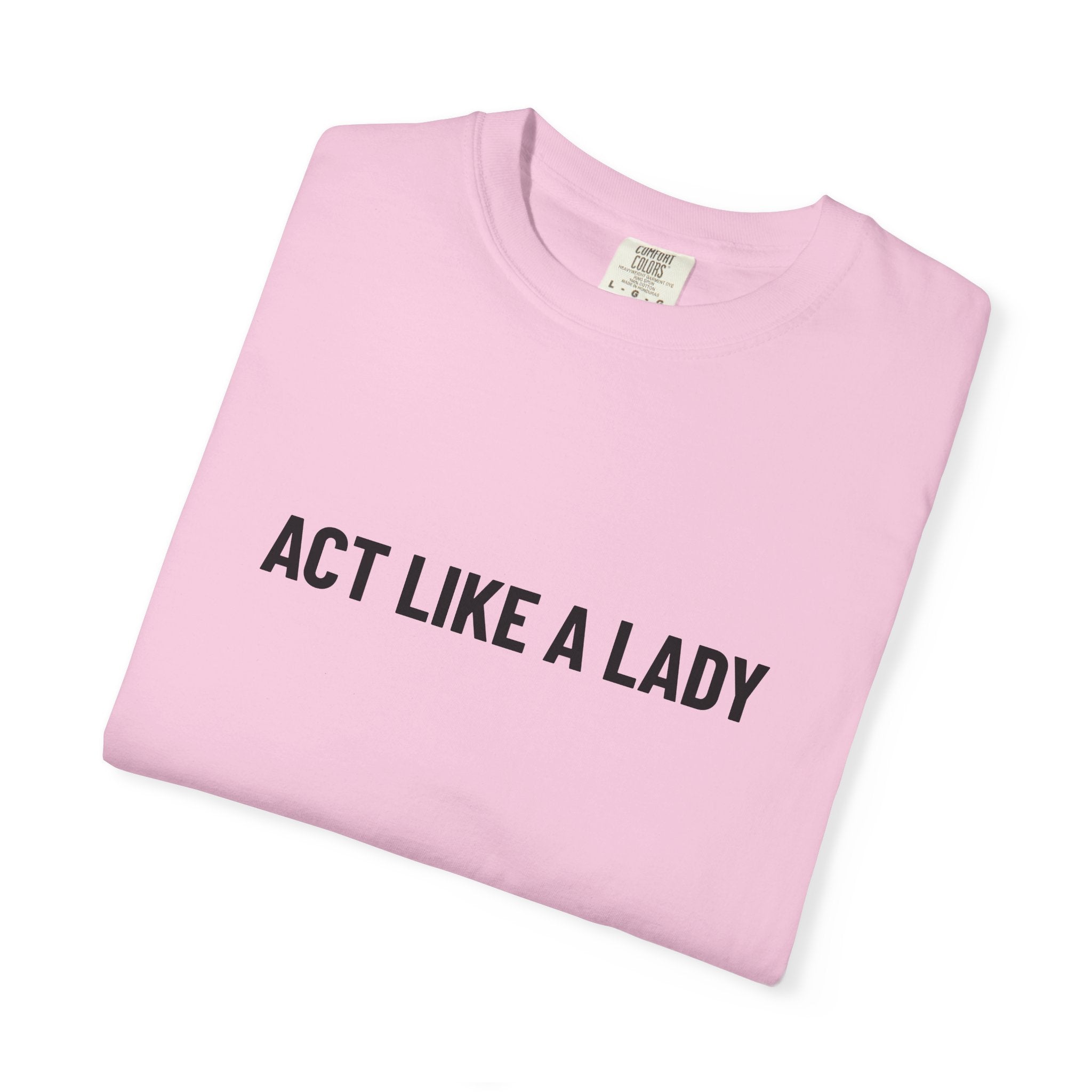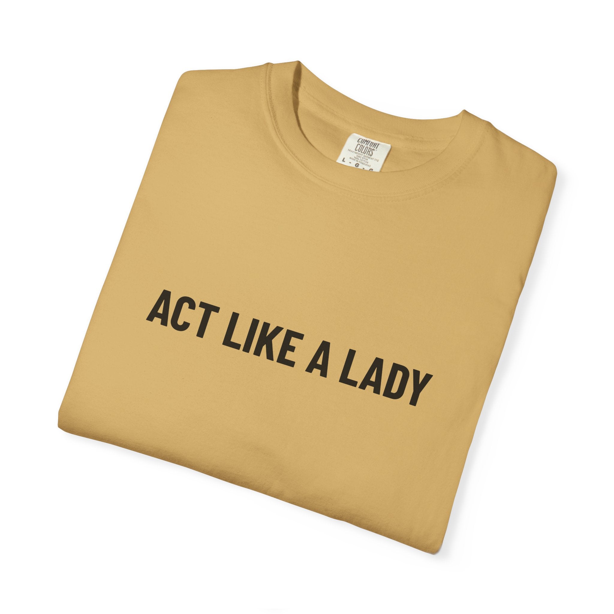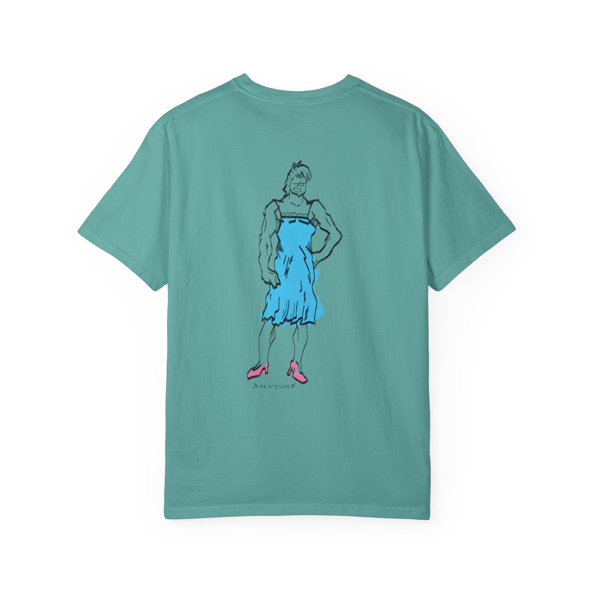 Soft as hell Comfort Colors tee for the masc who’s been aggressively lady-ed by strangers and family alike. Front says ‘Act Like a Lady’. Back features a masc lesbian in a dress looking like she lost a bet. Because nothing says femininity like visible discomfort in lace